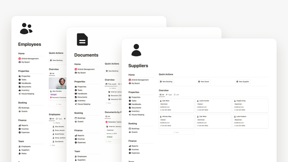 Effortlessly manage property, finance, guests, bookings, housekeeping, tasks, suppliers, employees, and team for your Airbnb business using our comprehensive Airbnb Management Notion template.