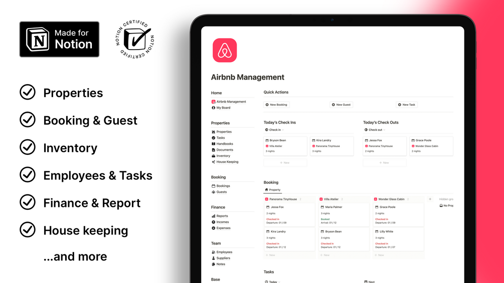 Effortlessly manage property, finance, guests, bookings, housekeeping, tasks, suppliers, employees, and team for your Airbnb business using our comprehensive Airbnb Management Notion template.