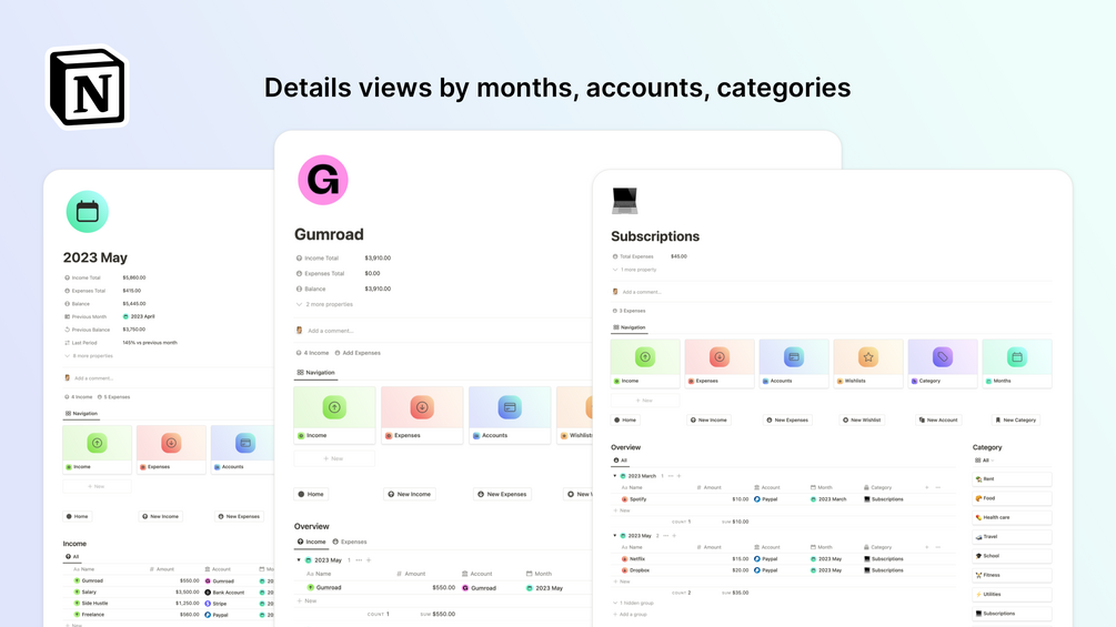 With the Finance Board Notion Template, you can organize your finances by accounts and categories, making it easy to understand where your money is coming from and where it's going. Monitor your spending habits, set up budgets, and receive real-time insights into your financial health.
