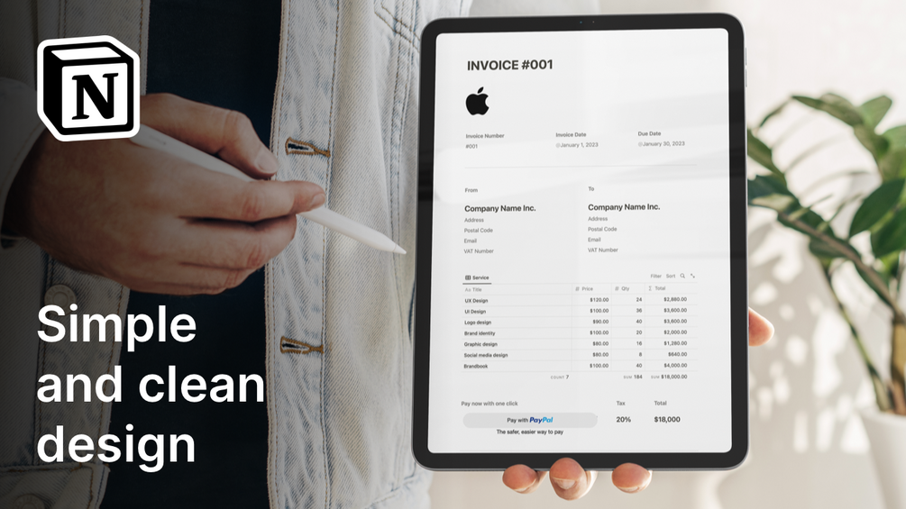 Create your simple and clean invoices with this Notion template for Free.