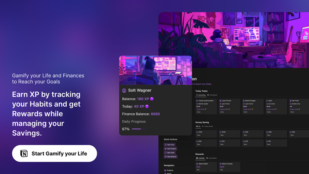 Transform your life into an RPG game: collect XP and earn rewards with this Notion template.