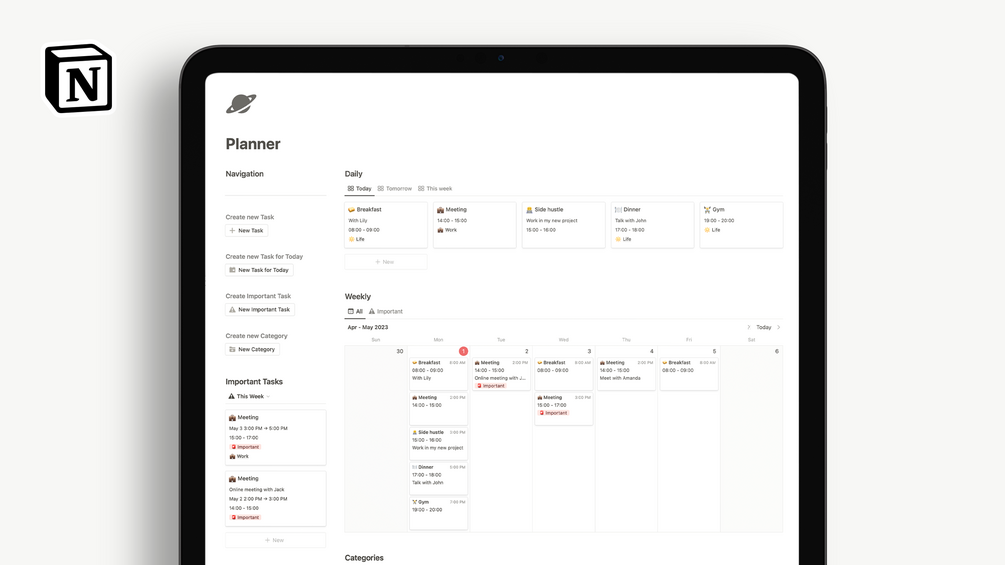 Are you struggling to manage your busy schedule and stay on top of important tasks? The Notion Planner Template can help. This powerful tool allows you to categorize your schedule by days, weeks, months, and meetings, so you can easily see what needs to be done and when. With the ability to prioritize tasks and track progress, you'll stay on top of deadlines and accomplish more in less time.