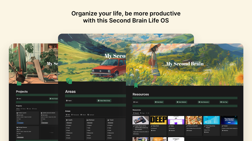 Supercharge your daily life with the ultimate second brain system. Organize and manage your life easily by connecting resources, notes, events, and finances to your projects. Get things done efficiently.