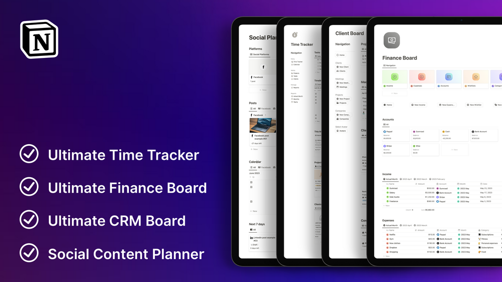 Supercharge Your Productivity with the Notion Ultimate Creator Kit: Time Tracker, Finance Board, CRM Board, and Social Content Planner!