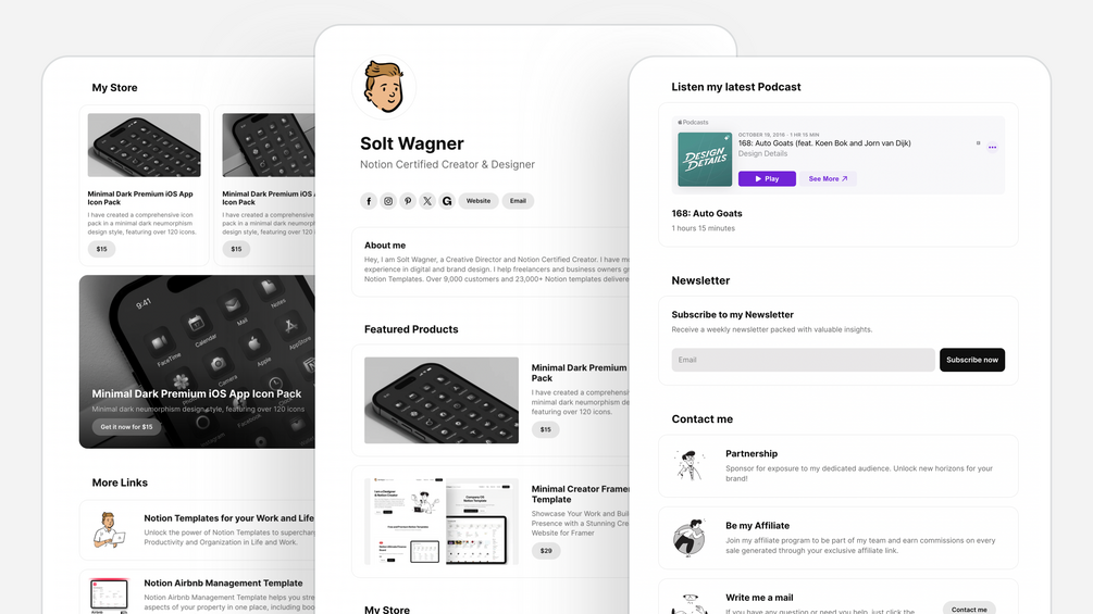 Free, minimal, and responsive Link in bio website. This includes a product cards carousel, featured cards, social icons, newsletter block, video and podcast embed block, and an about me block.